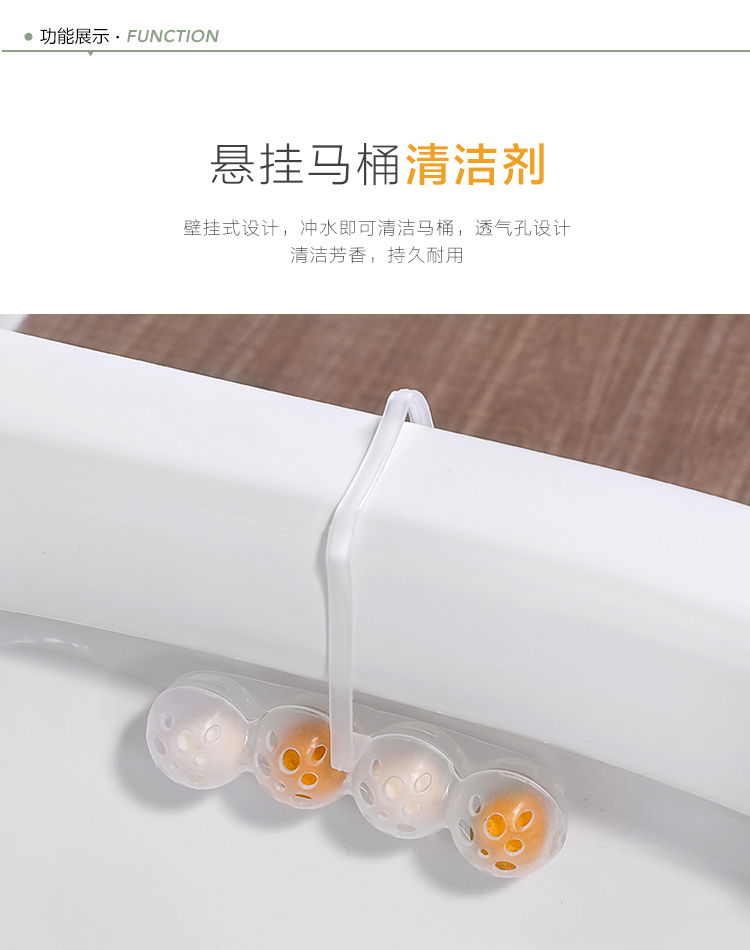 介绍: 挂壁设计,冲水即自动清洁马桶,清洁芳香二合一,通过缓慢释放纯净因子,持久耐用,持续性散发淡雅清香,卫生间洁净放心!