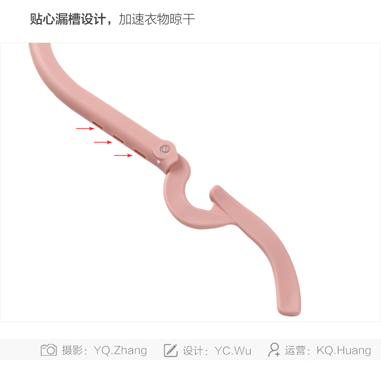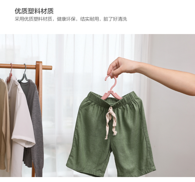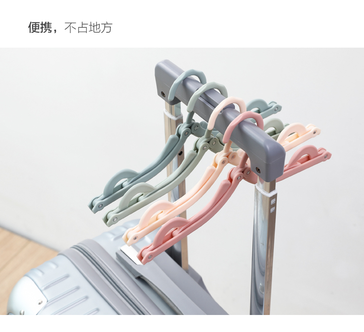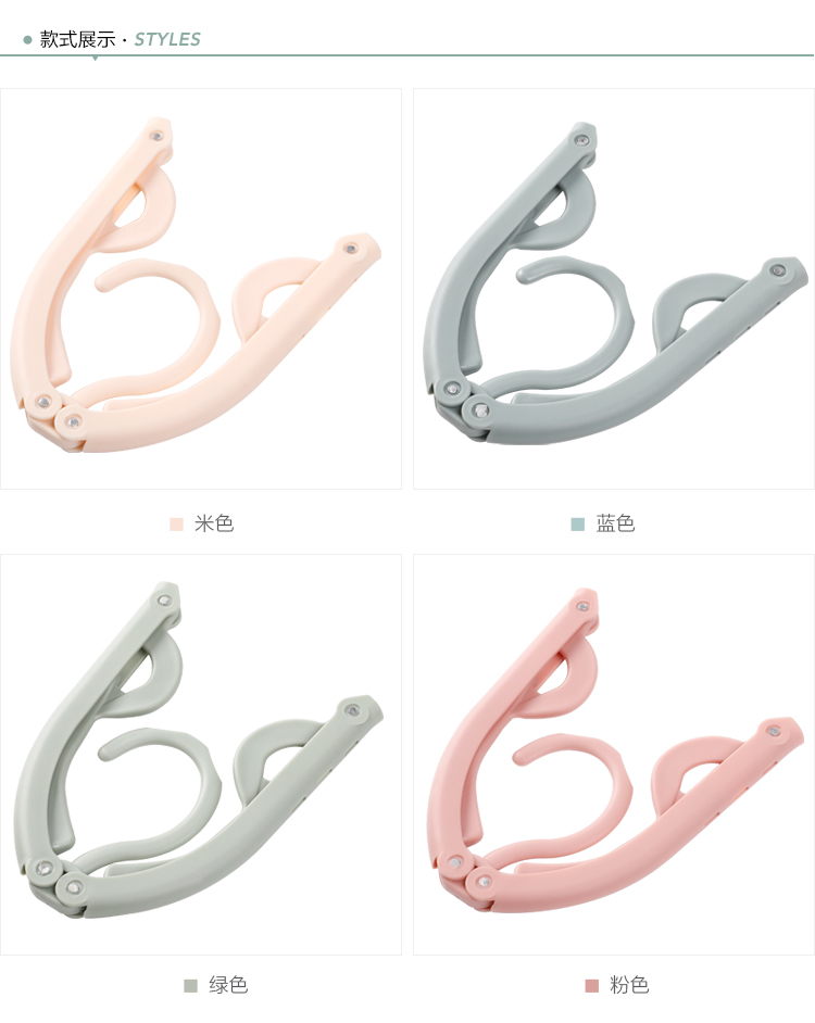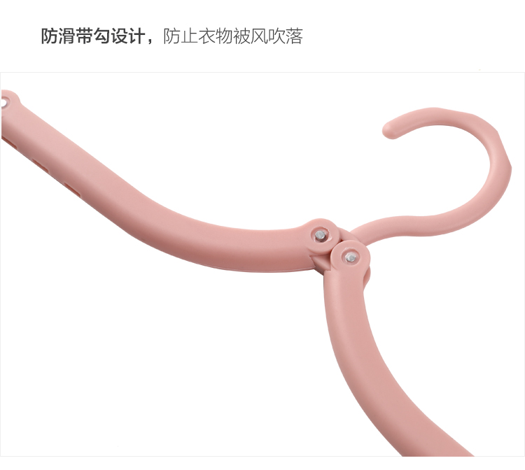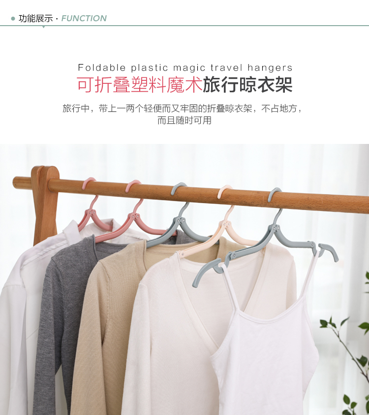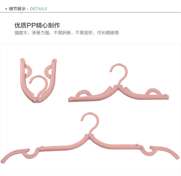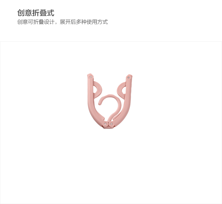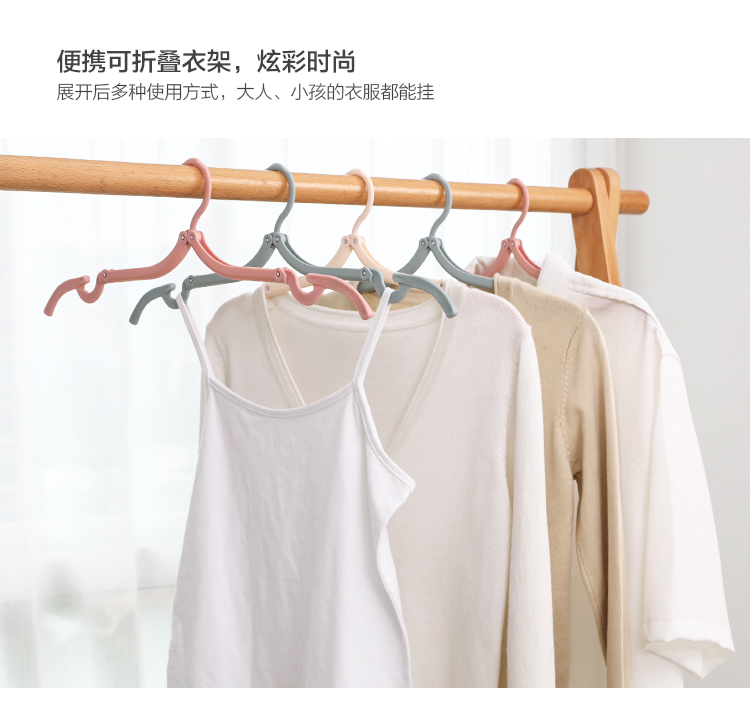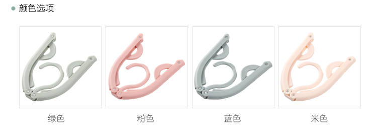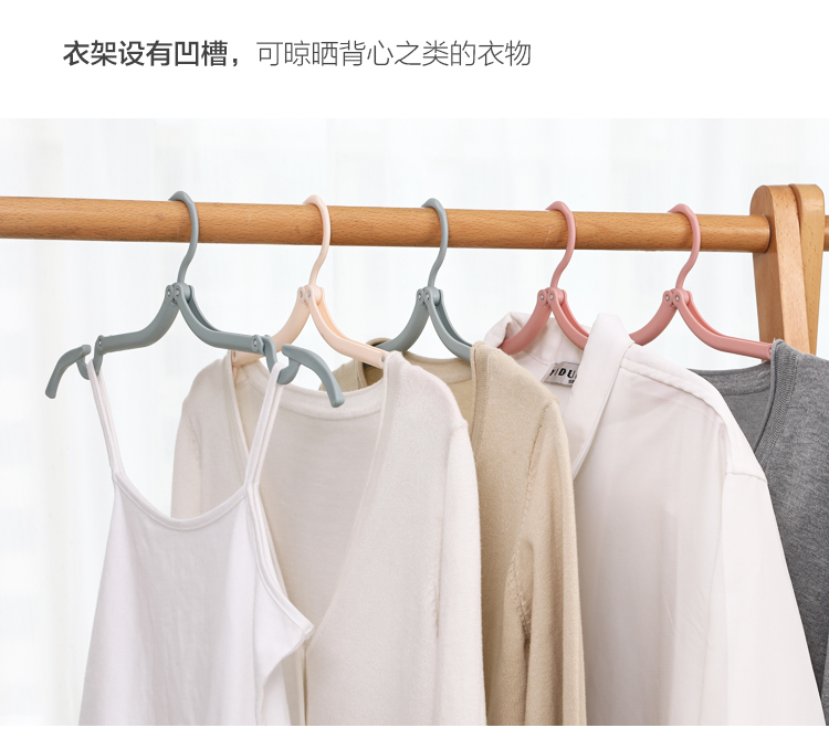 介绍: 小巧便携,不占地儿,折叠后只有手掌般大小,方便出行携带,放在背包,行李箱里不占地儿,衣架设有2处凹槽,晾晒吊带、背心、文胸等适合,美观又实用。