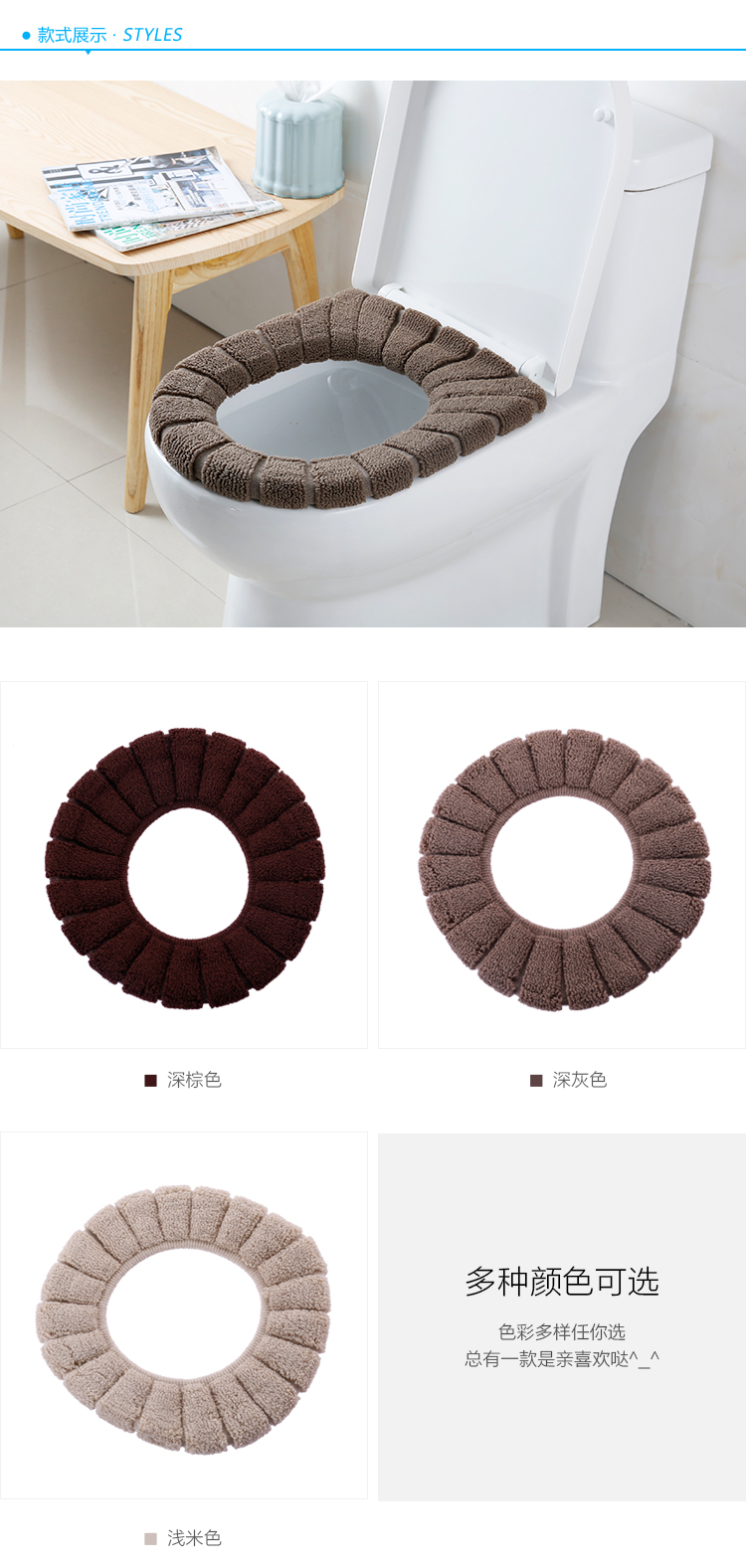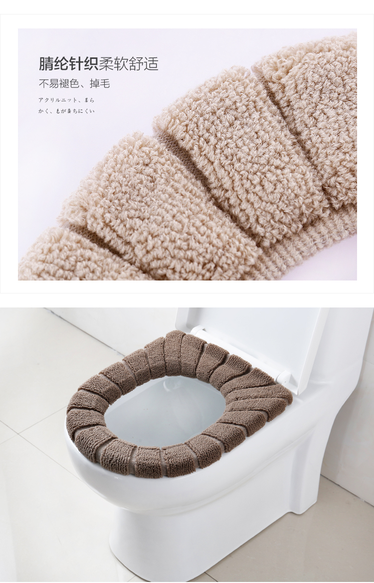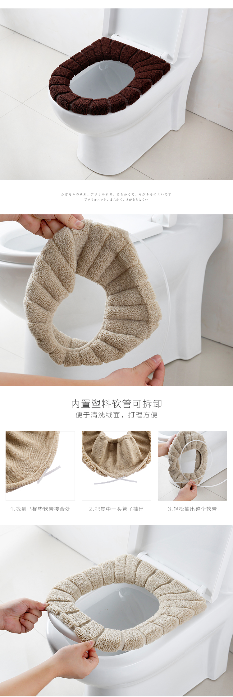 介绍: 腈纶材质,柔软舒适,不易掉毛。内置塑料管,可灵活改变形状,适用于大部分U型O型马桶。360度包裹马桶圈,拒绝冰冷,温暖如厕。