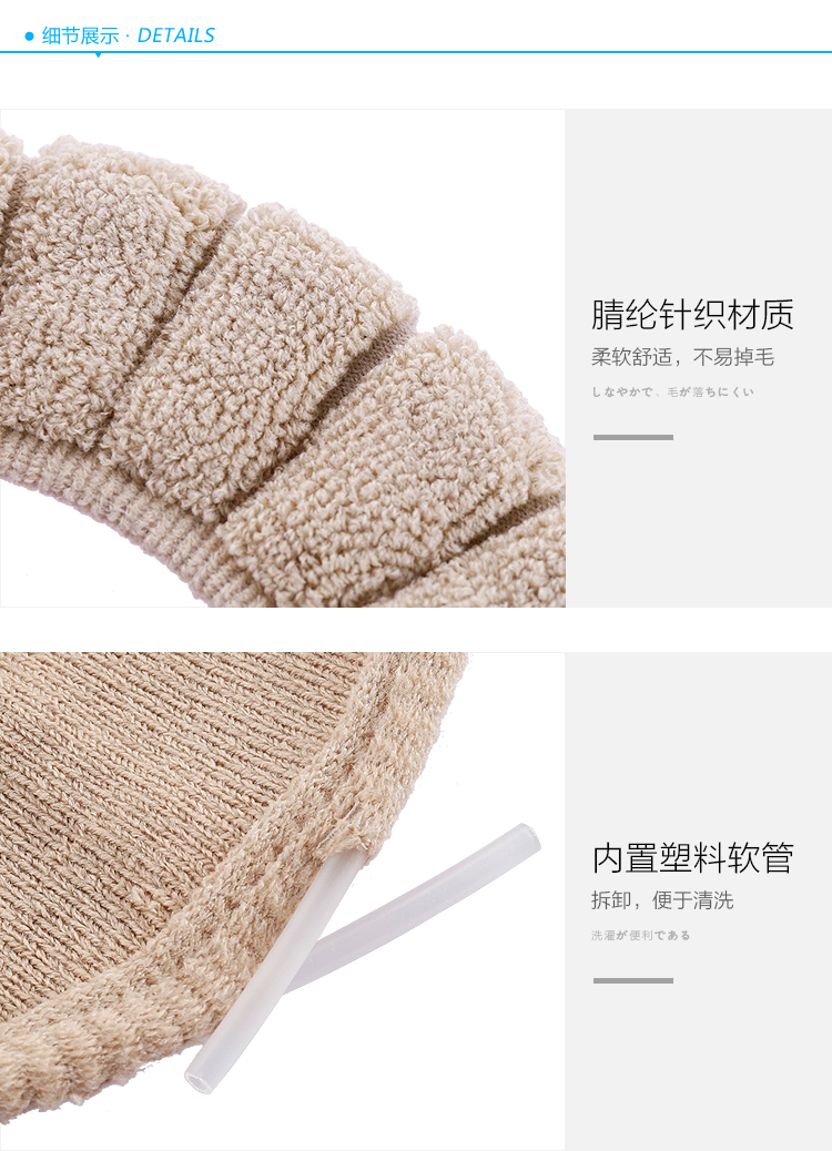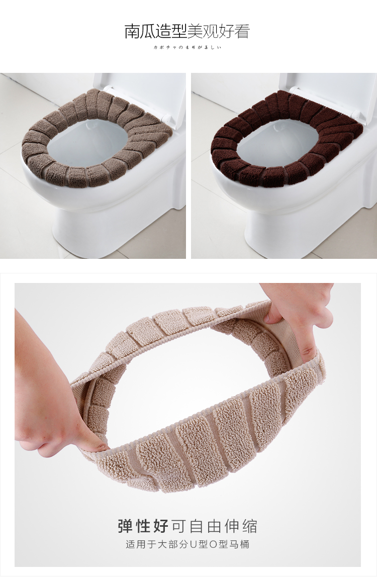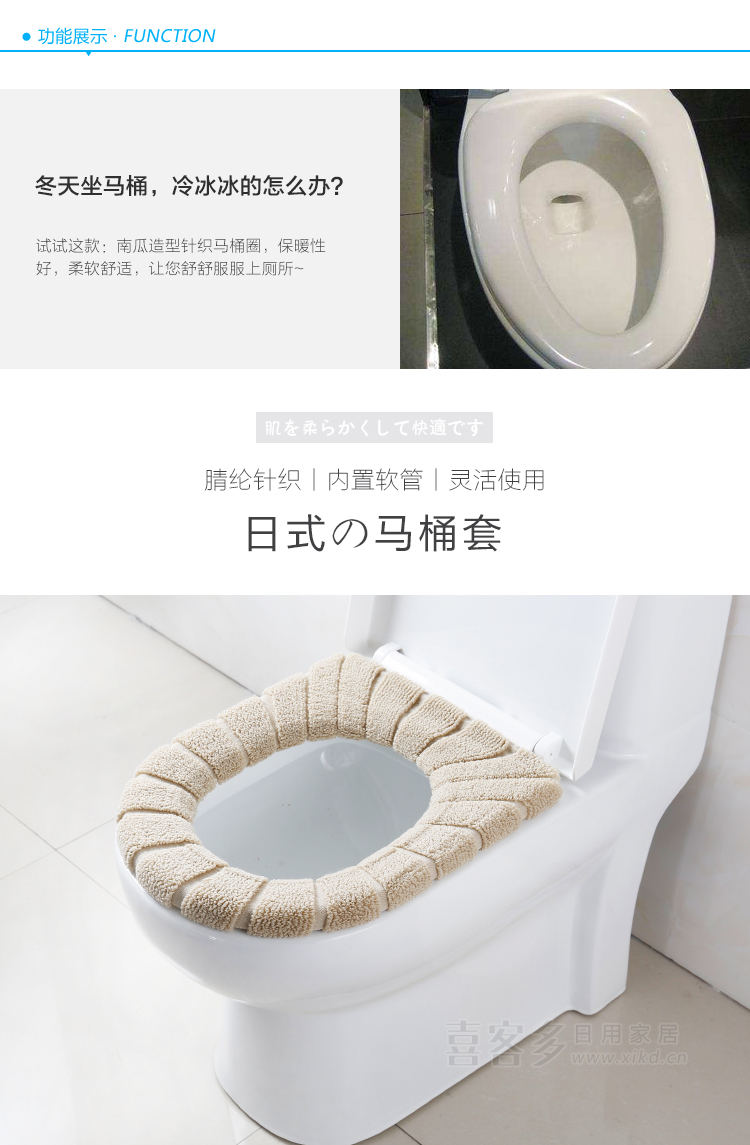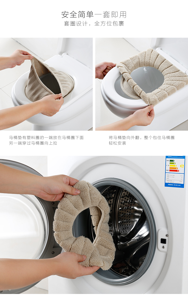 介绍: 腈纶材质,柔软舒适,不易掉毛。内置塑料管,可灵活改变形状,适用于大部分U型O型马桶。360度包裹马桶圈,拒绝冰冷,温暖如厕。