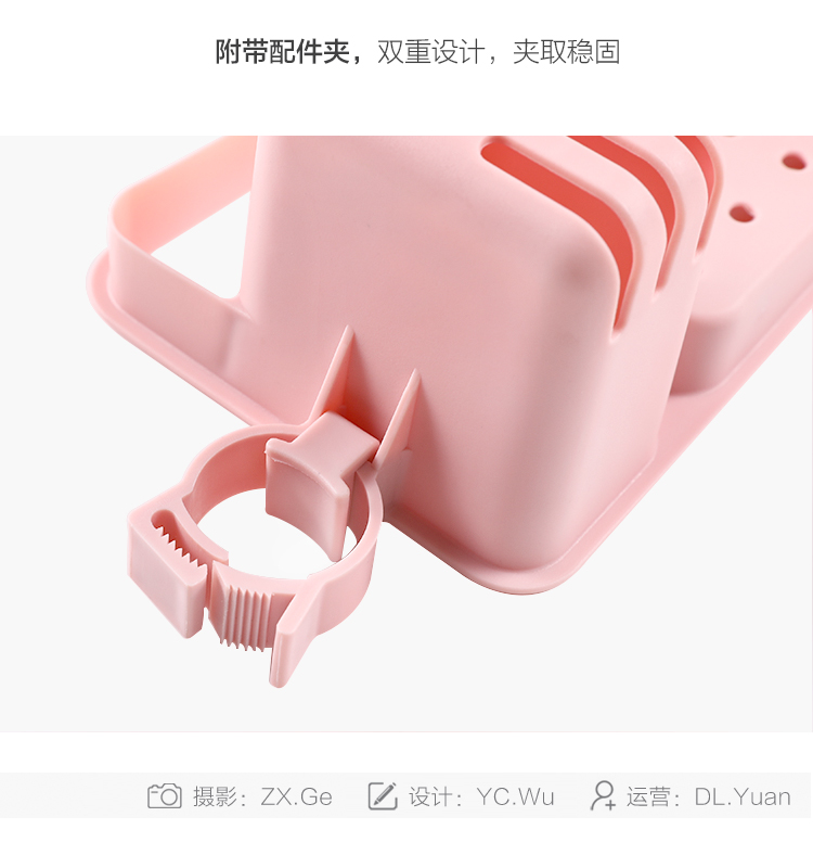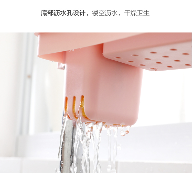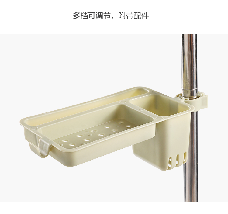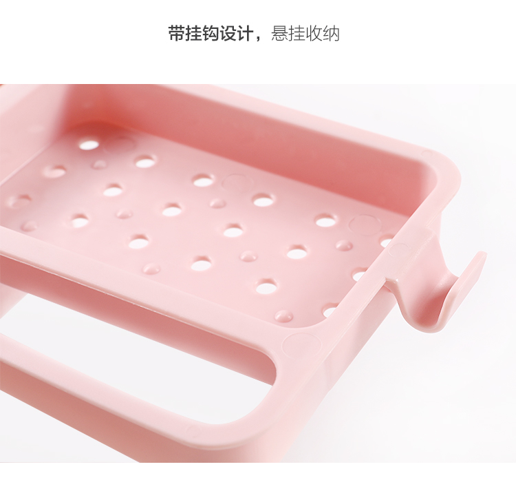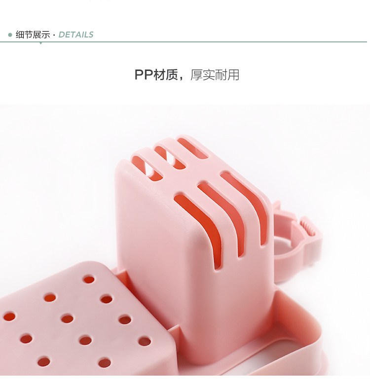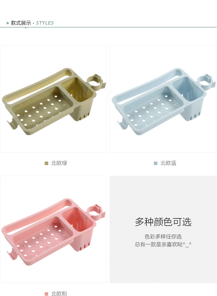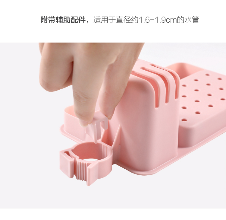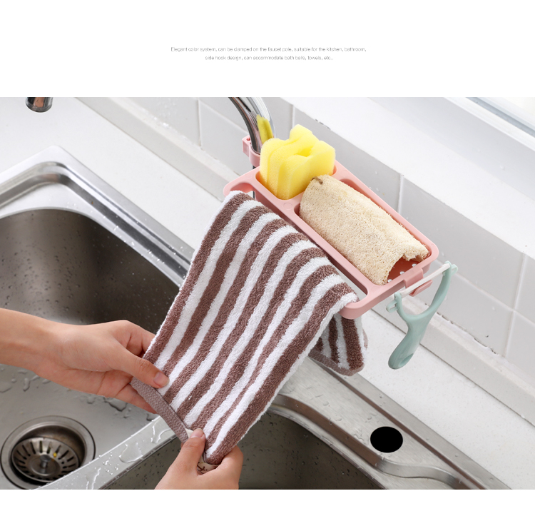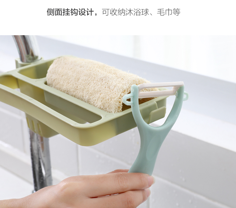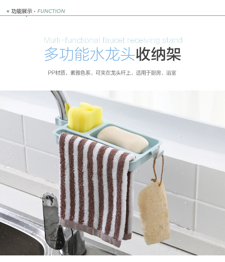 介绍: 水龙头置物架,PP材质,素雅色系,可夹在龙头杆上,多档可调节,附带配件,侧面带挂钩,适用于厨房、浴室,