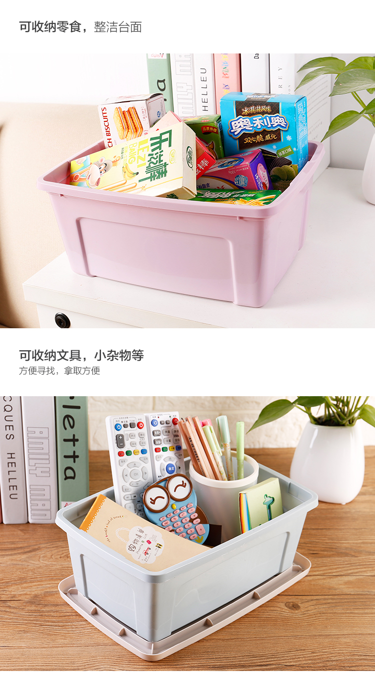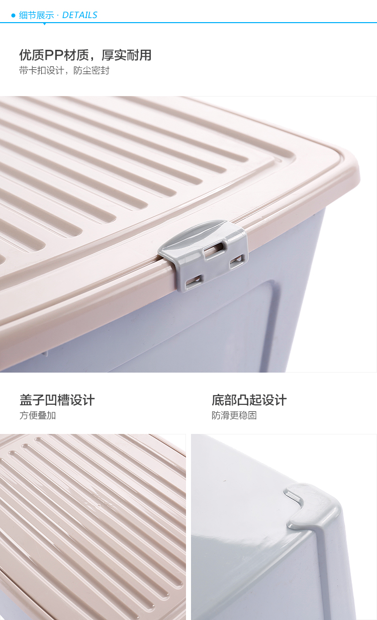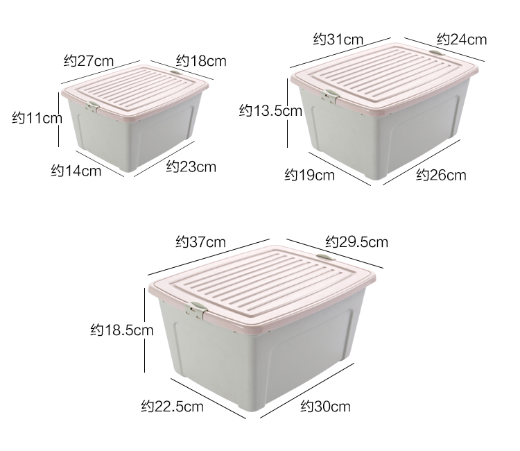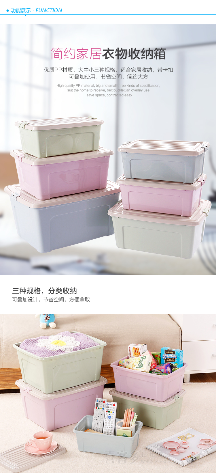 介绍: 优质PP材质,厚实耐用。大中小三种规格,适合家居收纳,带卡扣,可叠加使用。可收纳衣物、化妆品、零食、配料等,多功能实用。